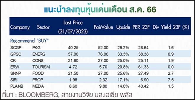 บล.เอเซีย พลัส ออกบทวิเคราะห์กลยุทธ์ลงทุน ระบุว่า ในเดือนสิงหานี้ คาดหวังให้ SET วิ่งต่อ โดยได้รับแรงหนุนจากปัจจัยภายนอกที่ดูดี วัฏจักรของดอกเบี้ยขาขึ้นใกล้จบ อีกทั้งความความกังวลในเรื่อง Recession ลดลง และจีนพร้อมออกมาตรการกระตุ้นเศรษฐกิจเพิ่มเติม ในส่วนของปัจจัยภายในประเทศมองว่าการเมืองพ้นจุดที่ร้อนแรงที่สุดไปแล้ว กำไรงวด 2Q66 น่าจะลดลง แต่จะกลับมาฟื้นชัดเจนขึ้นในปี 2H66 ทุกๆ ปัจจัยสนับสนุนให้ Fund Flow และสภาพคล่องกลับมาหนุนไทยมากขึ้น หุ้นเด่นเดือนส.ค. แนะนำ ERW, SCGP, GPSC, CK, SIRI, PLANB และ SNNP