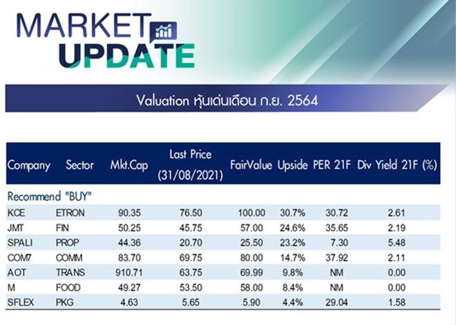 ในมุมของ Valuation ฝ่ายวิจัย ASPS คงดัชนีเป้าหมายที่ 1670 จุด ถือว่าสมเหตุสมผล ภายใต้ EPS64F ที่ 73.6 บาท/หุ้น มี Market Earning Yield Gap. อยู่ที่ระดับ 3.9% (ระดับเดียวกับค่าเฉลี่ยในอดีต) และ EPS Growth64F ที่ 38% รวมถึง PER64F ที่ 22.7 เท่า กลยุทธ์ในการเอาชนะตลาดในเดือน ก.ย. ต้องเน้นหุ้นที่มีผลประกอบการช่วงที่เหลือของปีโดดเด่น มีปัจจัยเฉพาะตัวหนุน โดยฝ่ายวิจัยฯ แบ่งธีมการลงทุนหลักๆ ออกเป็น 3 ธีม 7 หุ้นเด่น คือ หุ้น Low Interest Rate : SPALI , JMT หุ้น Earning Momentum : SFLEX , KCE หุ้น Re-open Economy : M, COM7, AOT