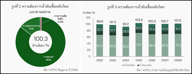 การใช้น้ำมันเชื้อเพลิงในประเทศไทยแบ่งเป็น 3 ตลาด คือ ภาคขนส่ง ซึ่งมีสัดส่วนความต้องการมากที่สุดราว 85% ตามมาด้วยภาคอุตสาหกรรม 15% และภาคการผลิตไฟฟ้า 0.2% (รูปที่ 2)