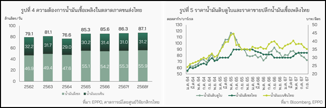 ในปี 2568 คาดว่า ความต้องการน้ำมันดีเซลในภาคขนส่งไทยจะขยายตัว 1.1% ชะลอตัวจาก 2.0% ในปี 2567 โดยได้รับแรงกดดันจากราคาขายปลีกดีเซลที่ยังอยู่ในระดับสูง (รูปที่ 4)