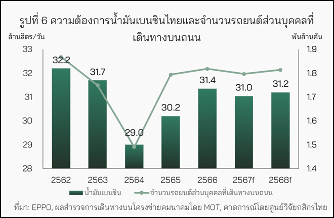 ในปี 2568 คาดว่า ความต้องการน้ำมันเบนซินในภาคขนส่งไทยจะขยายตัว 0.5% จากที่หดตัว 1.0% ในปี 2567 (รูปที่ 6)