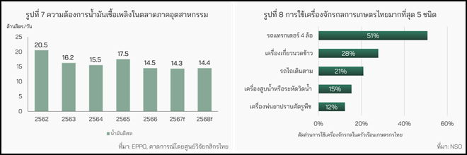 อุปสงค์น้ำมันดีเซลในภาคอุตสาหกรรมในปี 2568 คาดว่าจะเติบโตตามผลผลิตการเกษตรที่เพิ่มขึ้น ซึ่งทำให้การใช้เครื่องจักรกลการเกษตร โดยเฉพาะรถแทรกเตอร์ เครื่องเกี่ยวนวดข้าว และรถไถเดินตาม ที่มีการใช้งานราว 51% 28% และ 21% ของจำนวนครัวเรือนเกษตรกรไทย ตามลำดับ  มีแนวโน้มสูงขึ้น (รูปที่ 8)