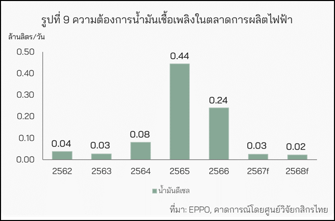 ก่อนปี 2565 การใช้น้ำมันดีเซลเพื่อผลิตไฟฟ้าในไทยมักมีสัดส่วนที่น้อยกว่า 0.1% ของปริมาณเชื้อเพลิงทุกประเภทที่ใช้ในการผลิตไฟฟ้า ทว่าในปี 2565 สัดส่วนเชื้อเพลิงดีเซลที่ใช้ในการผลิตไฟฟ้ากลับเพิ่มขึ้นแตะ 0.8% เพราะแหล่งก๊าซธรรมชาติเอราวัณหมดอายุสัมปทาน และอยู่ในช่วงเปลี่ยนผ่านสู่ผู้ประกอบการรายใหม่ ทำให้อุปทานก๊าซธรรมชาติซึ่งเป็นเชื้อเพลิงผลิตไฟฟ้าหลักของไทยเผชิญภาวะตึงตัว ส่งผลให้มีการใช้เชื้อเพลิงดีเซลเพื่อผลิตไฟฟ้ามากขึ้น อย่างไรก็ดี แหล่งก๊าซธรรมชาติเอราวัณทยอยเพิ่มกำลังการผลิต และกลับมาผลิตได้ตามปกติในช่วงต้นปี 2567 ทำให้การใช้เชื้อเพลิงดีเซลเพื่อผลิตไฟฟ้ามีแนวโน้มลดลงอย่างต่อเนื่อง และคาดว่าจะลดลงสู่ระดับ 0.02 ล้านลิตรต่อวันในปี 2568