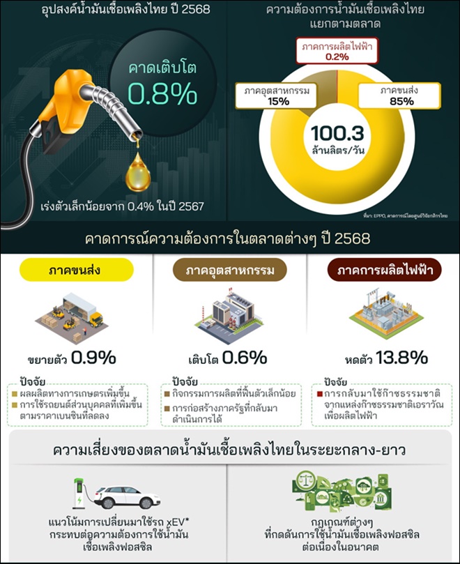 – ในปี 2568 อุปสงค์น้ำมันเชื้อเพลิงไทย คาดว่าจะโต 0.8% เร่งตัวเล็กน้อยจาก 0.4% ในปี 2567 โดยความต้องการในตลาดภาคขนส่งมีโอกาสขยายตัว 0.9% จากการเพิ่มขึ้นของผลผลิตทางการเกษตร และการใช้รถยนต์ส่วนบุคคล