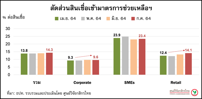 โควิด-19 ที่ปะทุขึ้นในช่วงระหว่างไตรมาสที่ 3 มีความรุนแรงและขยายเป็นวงกว้างย่อมมีผลกดดันสถานะทางการเงินของลูกหนี้หลายกลุ่ม ขณะที่ข้อมูลจากธปท. สะท้อนสัญญาณว่า ลูกหนี้มีแนวโน้มทยอยเข้ารับความช่วยเหลือจากสถาบันการเงินเพิ่มขึ้น โดยยอดภาระหนี้เข้ามาตรการช่วยเหลือฯ ขยับขึ้นจากจุดต่ำสุดของปีนี้ที่ 3.18 ล้านล้านบาท (จากจำนวนบัญชีลูกหนี้เข้ามาตรการฯ 4.77 ล้านบัญชี) ในเดือนเมษายน 2564 มาที่ 3.35 ล้านล้านบาท (จำนวนบัญชีลูกหนี้เข้ามาตรการฯ 5.12 ล้านบัญชี) ในเดือนกรกฎาคม 2564 โดยในจำนวนนี้ สัดส่วนกว่า 60% เป็นลูกหนี้ที่รับความช่วยเหลือฯ จากธนาคารพาณิชย์
