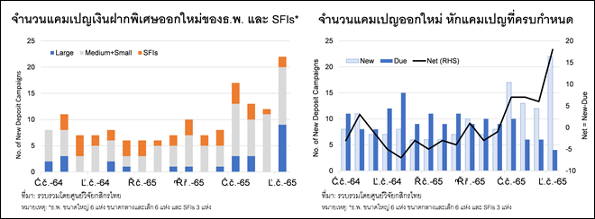 - จำนวนแคมเปญเงินฝากพิเศษหนาตาขึ้นตั้งแต่เดือนตุลาคม 2565 โดยแคมเปญเงินฝากพิเศษออกใหม่ของธนาคารพาณิชย์และสถาบันการเงินเฉพาะกิจของรัฐรวมกันแล้วมีจำนวนสูงกว่า 20 แคมเปญ โดยส่วนใหญ่เป็นการออกแคมเปญของธนาคารพาณิชย์ขนาดใหญ่และขนาดเล็กเป็นหลัก ซึ่งแม้ว่าส่วนหนึ่งอาจเป็นการออกเพื่อชดเชยโครงการ/แคมเปญเงินฝากที่ครบกำหนด หรือเตรียมจะครบกำหนด แต่เมื่อหักปัจจัยดังกล่าวแล้ว ก็ยังพบว่า มีสัญญาณการออกแคมเปญเงินฝากที่เร่งตัวขึ้น