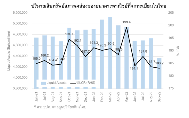 3) ปริมาณสภาพคล่องส่วนเกินที่ทยอยลดลง ดังจะเห็นได้จากสัดส่วนสินเชื่อต่อเงินฝากที่ปรับขึ้นจาก 93.0% ณ สิ้นเดือนพฤษภาคม 2565 มาที่ 95.0% ณ สิ้นเดือนกันยายน 2565 นอกจากนี้สัดส่วนสินทรัพย์สภาพคล่อง (% LCR) และปริมาณสินทรัพย์สภาพคล่องส่วนเกิน (จากประมาณการกระแสเงินสดไหลออกในระยะ 30 วัน) ได้ทยอยปรับตัวลดลงตั้งแต่ช่วงประมาณกลางปี 2565 โดยสาเหตุส่วนหนึ่งน่าจะมาจากการปรับพอร์ตการลงทุนในตราสารหนี้ และการปรับลดลงของมูลค่าตราสารหนี้ที่ถือครองตามราคาตลาด (Mark to Market) ในช่วงที่อัตราผลตอบแทนตราสารหนี้ไทยปรับสูงขึ้น ประกอบกับผู้ฝากเงินอาจมีการปรับเปลี่ยนการออมเงินในรูปเงินฝากบางส่วนไปลงทุนในหุ้นกู้