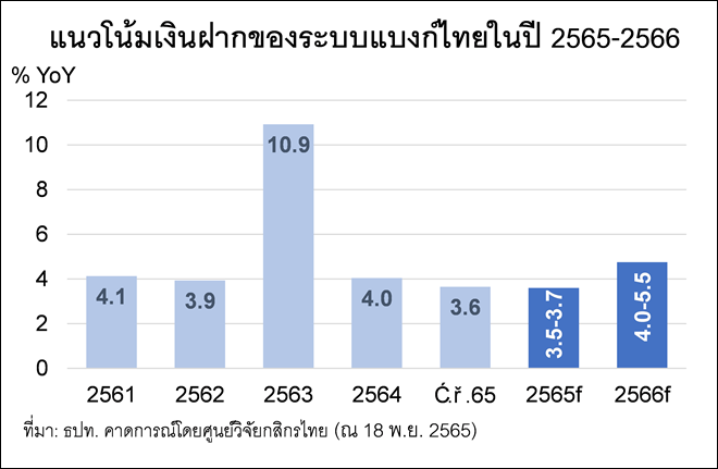 ส่วนประมาณการเงินฝากของระบบธนาคารพาณิชย์จดทะเบียนในประเทศ ณ สิ้นปี 2565 นี้ คาดว่าจะอยู่ที่ประมาณ 3.5-3.7% (เทียบกับ 4.0% ณ สิ้นปี 2564 และ 3.6% ณ สิ้นเดือนกันยายน 2565) ก่อนที่จะขยับขึ้นเล็กน้อยมาอยู่ในกรอบประมาณ 4.0-5.5% ในปี 2566 ตามทิศทางเศรษฐกิจที่น่าจะทยอยฟื้นตัว และการเตรียมสภาพคล่องเพื่อรองรับการเติบโตของสินเชื่อ