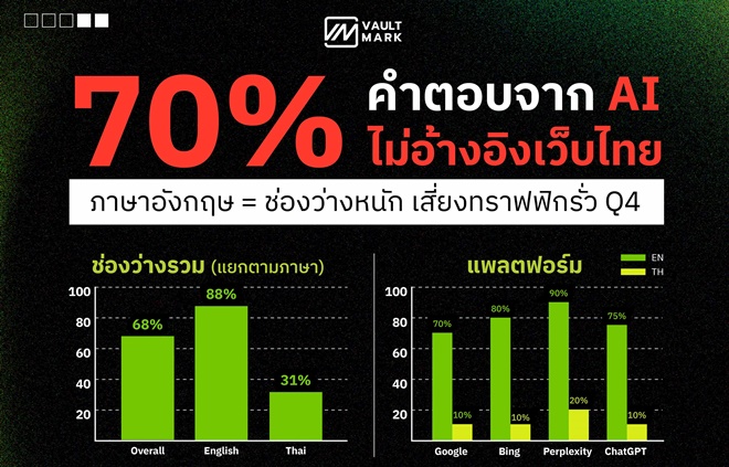 Vault Mark บริษัทที่ปรึกษากลยุทธ์ดิจิทัล เผยผลวิจัยล่าสุดที่น่าตกใจจากรายงาน “Thai GenSearch Citation Gap 2025” พบว่า แบรนด์ไทยกำลังเผชิญกับความเสี่ยงครั้งใหญ่ที่จะ “หลุดจากการมองเห็น” ของผู้บริโภคยุคใหม่ที่ใช้ AI Search (GenSearch) เป็นหลัก โดยมีตัวเลขชี้ชัดว่า 70% ของคำตอบจาก AI Search หลัก ๆ ไม่มีการอ้างอิงถึงเว็บไซต์ไทยแม้แต่ลิงก์เดียว