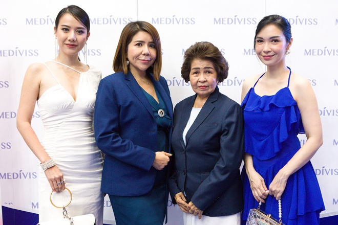 คุณกริน เกรียงไกรยกร กรรมการผู้จัดการ บริษัท เมดิวิสส์ จำกัด (ลำดับที่ 2 ซ้ายมือ) ควงแขนมากับคุณมณฑา เกรียงไกร (ลำดับที่ 2 ขวามือ) พร้อมด้วยนางสาววิมลลักษณ์ จงรัตนเมธีกุล (ลำดับที่ 1 ซ้ายมือ) และคุณนาขวัญ รายนานนท์ (ลำดับที่ 1 ขวามือ)