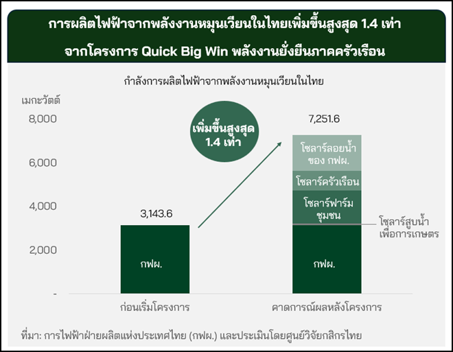 ศูนย์วิจัยกสิกรไทยประเมินว่าโครงการทั้งหมดนี้จะช่วยให้ ไฟฟ้าจากพลังงานหมุนเวียนในไทยเพิ่มขึ้นสูงสุด 1.4 เท่า และลดค่าไฟครัวเรือนราว 50 – 60%