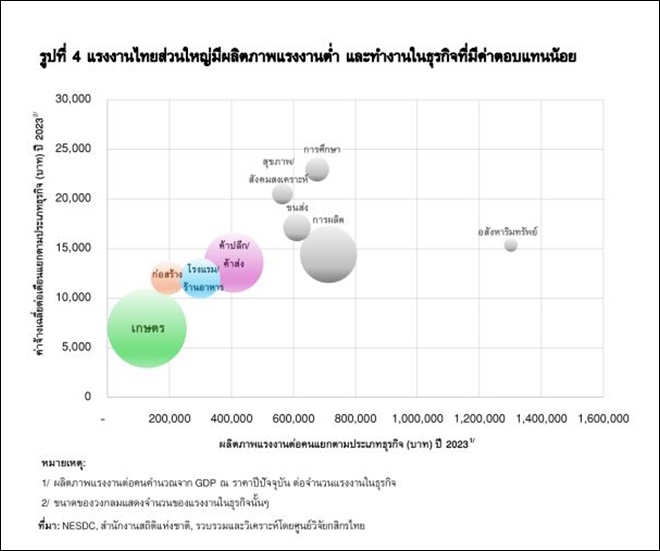2) แรงงานไทยมีผลิตภาพแรงงานต่ำ และส่วนใหญ่ทำงานอยู่ในธุรกิจที่มีค่าตอบแทนน้อย ผลิตภาพแรงงานไทยมีการขยายตัวเฉลี่ยต่อปีค่อนข้างต่ำอยู่ที่ราว 1.5% (CAGR 2014-2022) และส่วนใหญ่ประกอบอาชีพอยู่ในธุรกิจที่มีค่าตอบแทน/รายได้ต่ำ โดยเฉพาะในภาคเกษตรที่ผลิตภาพแรงงานน้อยที่สุดเมื่อเทียบกับภาคธุรกิจอื่นๆ แต่กลับมีสัดส่วนแรงงานที่ทำงานอยู่ในอุตสาหกรรมนี้สูงถึงราว 30% ของจำนวนผู้มีงานทำทั้งหมด ขณะที่แรงงานภาคเกษตรมีรายได้เฉลี่ยเพียง 6,975 บาทต่อเดือนเท่านั้น (รูปที่ 4) ส่งผลให้แรงงานกลุ่มนี้มีความสามารถในการบริโภคที่จำกัด