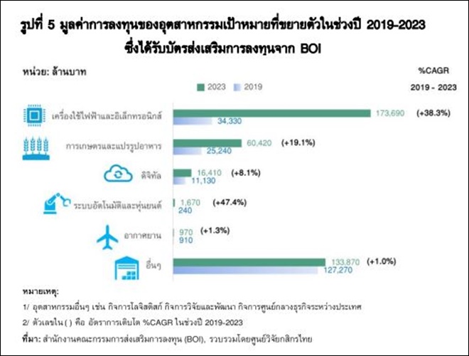 1) เพิ่มรายได้ของประชาชนให้สอดคล้องกับค่าครองชีพที่เพิ่มขึ้น โดยการปรับโครงสร้างการผลิต ควบคู่กับการพัฒนาทักษะแรงงานให้รองรับอุตสาหกรรมแห่งอนาคต แม้ว่าในช่วง 2-3 ปีที่ผ่านมา การลงทุนในอุตสาหกรรมเป้าหมายใหม่ที่มีการใช้เทคโนโลยีเข้มข้นและบริการที่มีมูลค่าสูง อาทิ อุตสาหกรรมระบบอัตโนมัติและหุ่นยนต์ เครื่องใช้ไฟฟ้าและอิเล็กทรอนิกส์ (เช่น เครื่องใช้ไฟฟ้าอัจฉริยะ แผงวงจร PCB/PCBA) อุตสาหกรรมดิจิทัล จะมีแนวโน้มเติบโตขึ้น (รูปที่ 5) แต่การลงทุนส่วนใหญ่ยังกระจุกตัวอยู่แค่ผู้ประกอบการหรือนักลงทุนรายใหญ่ ในขณะที่ผู้ประกอบการขนาดกลางและย่อม หรือ SMEs อีกจำนวนมาก ที่ยังต้องรอการช่วยเหลือหรือเร่งผลักดันให้เกิดการเปลี่ยนแปลงจากภาครัฐ