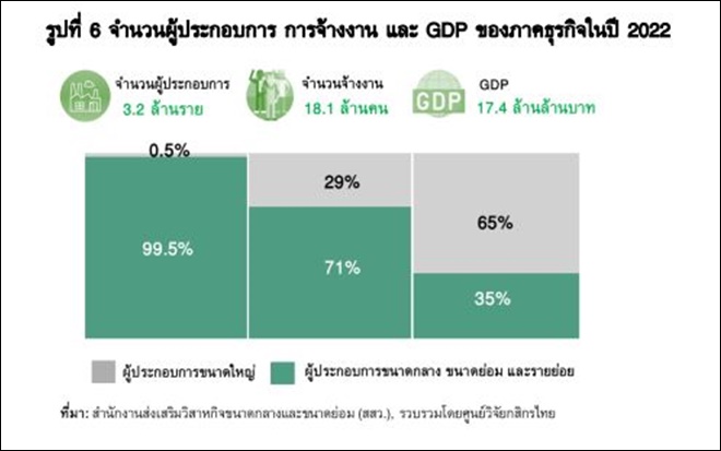 ทั้งนี้ ถ้าพิจารณาโครงสร้างเศรษฐกิจของประเทศ พบว่า มีจำนวนผู้ประกอบการ SMEs รวม 3.18 ล้านราย หรือคิดเป็นสัดส่วน 99.5% ของผู้ประกอบการทั้งหมด (3.2 ล้านราย) มีสัดส่วนการจ้างงานสูงถึง 71% แต่กลับสร้างรายได้ให้กับประเทศคิดเป็นสัดส่วนเพียง 35% ของ GDP เท่านั้น (รูปที่ 6) และมีแนวโน้มที่การสร้างรายได้อาจลดลงจากการแข่งขันที่รุนแรงขึ้นจากการขยายตลาดของรายใหญ่