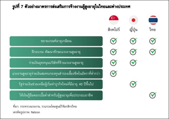– ส่งเสริมการจ้างงานผู้สูงอายุในหน่วยงานภาครัฐ และมีมาตรการทั้งจูงใจให้ภาคเอกชนจ้างงานผู้สูงอายุ รวมถึงการพัฒนาทักษะแรงงานให้ผู้สูงอายุยังมีงานทำต่อ ซึ่งไทยและหลายประเทศได้มีมาตรการส่งเสริมการจ้างงานผู้สูงอายุ เช่น การจ่ายค่าจ้างเงินอุดหนุนให้แก่ธุรกิจที่จ้างงานผู้สูงอายุ การให้เงินกู้ยืม/เงินช่วยเหลือในการประกอบอาชีพ เป็นต้น (รูปที่ 7)