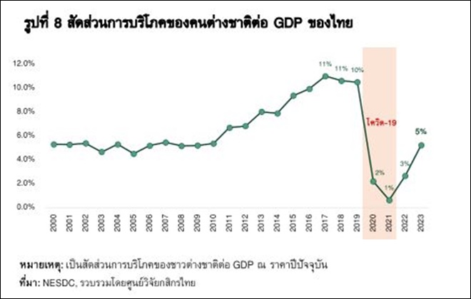 3) ดึงชาวต่างชาติที่มีกำลังซื้อหรือแรงงานต่างชาติที่มีทักษะสูงเข้ามา เพื่อสร้างรายได้ให้กับประเทศ โดยยังรักษามาตรฐานของสินค้าและบริการ และการเข้าถึงของคนในประเทศ การใช้จ่ายของชาวต่างชาติเป็นอีกกลุ่มที่มีความสำคัญในการสร้างรายได้ให้กับประเทศ โดยในปี 2566 ชาวต่างชาติมีการใช้จ่ายหรือการบริโภคในประเทศคิดเป็นสัดส่วน 5% ของ GDP ทยอยฟื้นตัวกลับไปสู่ช่วงก่อน โควิดที่มีสัดส่วนการบริโภคราว 11% (รูปที่ 8)