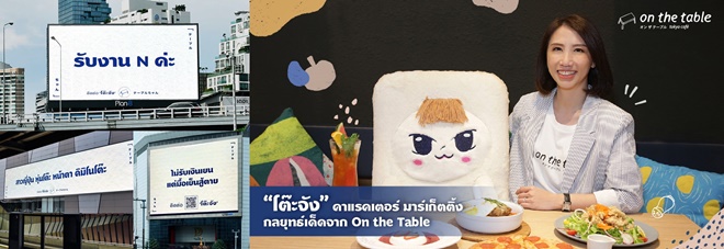 On the Table ร้านอาหารสไตล์โตเกียวคาเฟ่ ชูกลยุทธ์การตลาดจากอินไซต์ของผู้บริโภค ในรูปแบบ คาแรคเตอร์ มาร์เก็ตติ้ง ปล่อยหมัดเด็ด น้อง “โต๊ะจัง” ออกมาสร้างกระแสทั่วโลกออนไลน์ เพื่อทำให้แบรนด์ใกล้ชิดกับ คนในยุคใหม่มากขึ้น พร้อมทั้งสร้างภาพจำแบรนด์ที่สร้างความสุขบนโต๊ะอาหาร ตามคอนเซ็ปต์ Happiness is On the Table ได้อย่างชัดเจน
