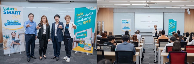 โลตัส ร่วมกับ บริษัท พีเอ็มจี คอร์ปอเรชั่น (PMG) ผู้นำด้านการยกระดับ SMEs ไทยให้เติบโตอย่างเข้มแข็ง ออกแบบหลักสูตรพิเศษ “Lotus’s SMART SME ติวเข้ม SME สู่เถ้าแก่แฟรนไชส์” นำร่อง 4 รุ่น พัฒนาผู้ประกอบการกว่า 100 กิจการ เปิดโอกาสให้ผู้ประกอบการรายย่อยของโลตัสที่ต้องการขยายธุรกิจ ได้เรียนรู้แบบเจาะลึกเรื่องการสร้างระบบแฟรนไชส์ ผ่านการติวเข้มแบบไฮบริดทั้งออนไลน์และออนไซต์กับผู้เชี่ยวชาญ สร้างเครือข่ายธุรกิจกลุ่มผู้ประกอบการ สนับสนุนพื้นที่ขยายสาขาในโลตัสทั่วประเทศ ผสาน CP Seeding Social Impact ต่อยอดจัดกิจกรรมเพิ่มเติมหลังจบหลักสูตร เพื่อสร้างรากฐานและสนับสนุน SME ให้เข้าสู่ตลาดโมเดิร์นเทรดอย่างแข็งแกร่ง พร้อมจับมือกับ ธนาคารพัฒนาวิสาหกิจขนาดกลางและขนาดย่อมแห่งประเทศไทย (SME D Bank) แนะนำการเตรียมความพร้อมก่อนหาแหล่งเงินทุนและการจัดการเครดิตบูโร สนับสนุนการขยายธุรกิจของ SME แบบรอบด้าน เดินหน้าการเป็นแพลตฟอร์มแห่งโอกาสสำหรับผู้ประกอบการ SME สู่การเติบโตไปด้วยกันอย่างยั่งยืน