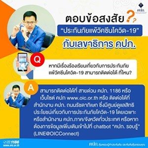 A: สามารถติดต่อได้ที่ สายด่วน คปภ. 1186 หรือ เว็บไซต์ คปภ www.oic.or.th หรือติดต่อได้ที่สำนักงาน คปภ. ถนนรัชดาภิเษก ซึ่งมีศูนย์ดูแลสิทธิประโยชน์เกี่ยวกับการประกันภัยโควิด-19 โดยเฉพาะ หรือสำนักงาน คปภ.ภาค/จังหวัดทั่วประเทศ หรือหากต้องการข้อมูลเพิ่มเติมเข้าไปที่ chatbot “คปภ. รอบรู้” (LINE@OICConnect)