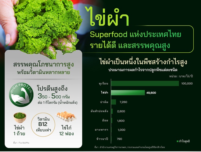 📍ไข่ผำสามารถทำกำไรได้ถึง 49,600 บาทต่อไร่ต่อปี ซึ่งสูงกว่าพืชเศรษฐกิจหลักไทย เช่น ปาล์ม,มันสำปะหลัง, อ้อย, ยางพารา และข้าว หลายเท่าตัว แต่ยังเป็นรองทุเรียนที่สามารถทำกำไรได้ราว 100,000 บาทต่อไร่ต่อปี อย่างไรก็ดี ไข่ผำสามารถเริ่มเก็บเกี่ยวได้ภายใน 2 สัปดาห์หลังจากเริ่มเพาะเลี้ยง