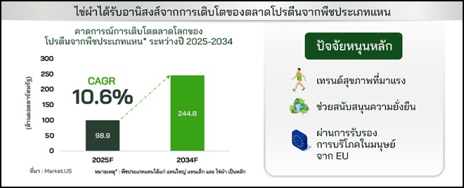📍ไข่ผำได้รับอานิสงส์จากการเติบโตในตลาดโปรตีนที่ทำจากพืชตระกูลแหน (แหนใหญ่ แหนเล็ก ไข่ผำ เป็นหลัก) โดยในปี 2025 คาดการณ์ว่าจะมีมูลค่าตลาดโลกอยู่ที่ 98.9 ล้านดอลลาร์สหรัฐ และในปี 2034 จะมีมูลค่าตลาดสูงถึง 244.8 ล้านดอลลาร์สหรัฐ คิดเป็นอัตราการเติบโตเฉลี่ยต่อปี 10.6% (CAGR) จากปัจจัยหนุนหลัก ได้แก่ การเติบโตของเทรนด์รักสุขภาพที่กำลังมาแรง การที่ผู้คนหันมาสนับสนุนความยั่งยืนมากยิ่งขึ้น และ เป็นผลิตภัณฑ์ที่ได้ยอมรับจากทางสหภาพยุโรป ทำให้ผู้คนมองเห็นถึงความน่าเชื่อถือและความปลอดภัยในการรับประทาน