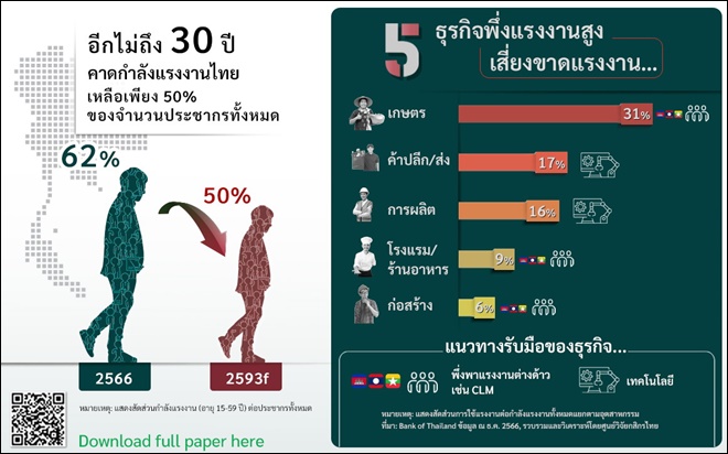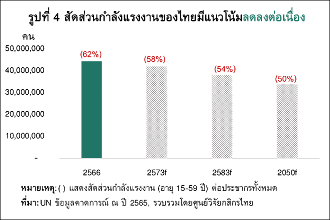 โครงสร้างประชากรที่เปลี่ยนไป ทำให้ภาคธุรกิจมีแนวโน้มจะยิ่งเผชิญความท้าทายจากการขาดแคลนกำลังแรงงาน โดยอีกไม่ถึง 30 ปีข้างหน้า คาดว่าสัดส่วนกำลังแรงงานของไทย (อายุ 15-59 ปี) ต่อประชากรทั้งหมดจะลดลงจาก 62% ในปี 2566 เหลือเพียงราว 50% ในปี 2593 (รูปที่ 4)