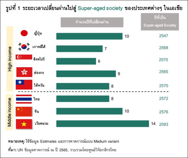 ไทยกำลังเผชิญการเปลี่ยนแปลงด้านโครงสร้างประชากร โดยมีการคาดการณ์ว่า ราวปี 2572 ไทยจะกลายเป็นประเทศกำลังพัฒนาประเทศแรกในเอเชียที่เปลี่ยนผ่านจากสังคมสูงวัยขั้นสมบูรณ์ (Aged society) ไปสู่สังคมสูงวัยขั้นสุดยอด (Super-aged society) โดยการเปลี่ยนผ่านของไทยใช้เวลาเพียงแค่ 8 ปีเท่านั้น ซึ่งใกล้เคียงกับประเทศพัฒนาแล้ว ขณะที่ ไทยอาจยังไม่ได้มีความพร้อมรับมือกับสังคมสูงวัยเทียบเท่าประเทศเหล่านี้ (รูปที่ 1)