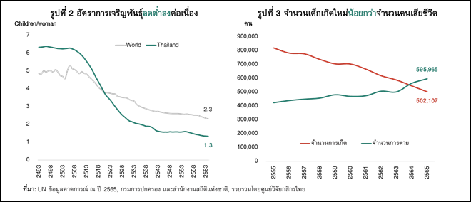 1) นโยบายคุมกำเนิด และค่านิยมที่คนต้องการมีบุตรน้อยลง ส่งผลให้อัตราการเจริญพันธุ์ของไทยลดลงต่อเนื่อง และอยู่ต่ำกว่าค่าเฉลี่ยของโลก (รูปที่ 2)