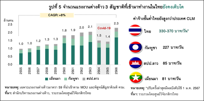 ดังนั้น ความท้าทายด้านปริมาณจากการขาดแคลนกำลังแรงงานคงกระทบกับการจัดหาแรงงานทักษะต่ำ ซึ่งบางธุรกิจ เช่น ธุรกิจก่อสร้าง และธุรกิจบริการต่างๆ อาจรับมือการขาดแคลนแรงงานด้วยการพึ่งพิงแรงงานต่างด้าวจากประเทศในกลุ่ม CLM (กัมพูชา สปป.ลาว เมียนมา) สะท้อนจากจำนวนแรงงานจากทั้ง 3 ประเทศที่อยู่ในไทยเติบโตจากปี 2556 ที่ราว 1.0 ล้านคน ไปเป็นราว 2.3 ล้านคนในปี 2566 หรือโตเฉลี่ยต่อปีราว 8% (รูปที่ 5) จากไทยยังมีค่าแรงขั้นต่ำที่สูงกว่าประเทศเหล่านี้
