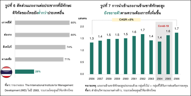 ทั้งนี้ หากพิจารณาโครงสร้างตลาดแรงงานไทยพบว่าประกอบไปด้วย แรงงานทักษะต่ำคิดเป็นสัดส่วนราว 82% (แรงงานภาคเกษตร แรงงานก่อสร้าง แรงงานในโรงงาน) แรงงานทักษะปานกลางราว 16.5% (แรงงานในภาคบริการ พนักงานขายสินค้า) และแรงงานทักษะสูงราว 1.5% (วิศวกร แพทย์ อาจารย์ วิชาชีพต่างๆ)