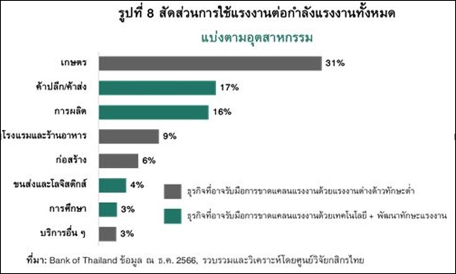 ศูนย์วิจัยกสิกรไทยมองว่า การขาดแคลนแรงงานจะยิ่งรุนแรงขึ้นในช่วงข้างหน้า และจะกระทบต่อธุรกิจที่มีสัดส่วนการใช้แรงงานต่อจำนวนกำลังแรงงานทั้งหมดสูง (รูปที่ 8) โดยเฉพาะในภาคเกษตร (31%) และภาคบริการต่างๆ เช่น ธุรกิจโรงแรมและร้านอาหาร (9%) และธุรกิจก่อสร้าง (6%) ซึ่งการเปลี่ยนแปลงโครงสร้างประชากรจากการเป็นสังคมสูงวัยคงทำให้ธุรกิจเหล่านี้อาจต้องหันไปพึ่งพิงแรงงานต่างด้าวทักษะต่ำจากประเทศเพื่อนบ้านในสัดส่วนที่มากขึ้น ขณะที่ บางธุรกิจ เช่น ธุรกิจค้าปลีก/ค้าส่ง (17%) และธุรกิจการผลิต (16%) ที่สามารถแก้ปัญหาด้วยเทคโนโลยีได้อาจต้องพิจารณาถึงโอกาสในการนำหุ่นยนต์/นวัตกรรมมาประยุกต์ใช้เพื่อเพิ่มประสิทธิภาพ ควบคู่ไปกับการยกระดับผลิตภาพ/ทักษะแรงงานไทยให้เท่าทันเทคโนโลยีที่มีการพัฒนาอย่างไม่หยุดนิ่ง