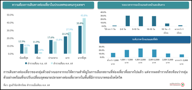 กลุ่มตัวอย่างคนกรุงเทพฯ มีความต้องการที่จะเดินทางท่องเที่ยวในประเทศมากถึงมากที่สุดคิดเป็นสัดส่วน 73.7% ของผู้ตอบแบบสอบถาม หลังจากที่คนกรุงเทพฯต้องเผชิญกับการระบาดอย่างหนักของโควิด ข้อจำกัดจากมาตรการการเดินทางข้ามจังหวัด และการที่ต้องใช้เวลาอยู่ในที่พักอาศัยจากเคอร์ฟิว และการที่ต้องทำงานที่บ้านเป็นระยะเวลาที่ยาวนาน  โดยเพิ่มขึ้นจากผลสำรวจในช่วงเดือนก.ย. ที่ผ่านมา ซึ่งสะท้อนได้ว่าเมื่อสถานการณ์ต่างๆ ดีขึ้น กลุ่มตัวอย่างมีความเชื่อมั่นที่จะเดินทางท่องเที่ยวมากขึ้น
