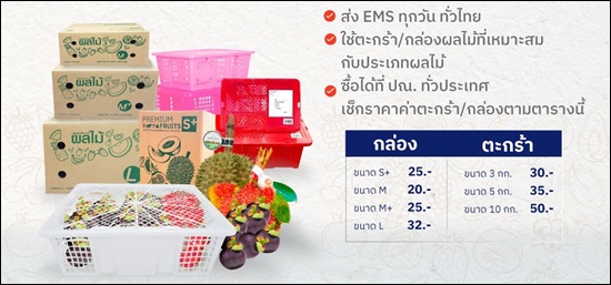 ทั้งนี้ ที่ผ่านมาได้มีการจำหน่ายกล่อง – ตะกร้าผลไม้ที่หลากหลายขนาดให้เลือกตามความเหมาะสมกับปริมาณ รวมถึงการรักษาคุณภาพของผลไม้ และเพื่อยกระดับด้านดังกล่าวให้มีประสิทธิภาพที่ดียิ่งขึ้น ล่าสุดจึงได้เปิดตัวกล่องส่งทุเรียนโดยเฉพาะ “ไซส์เอสพลัส : S+” ซึ่งเป็นกล่องขนาดใหม่ทรงสี่เหลี่ยมผืนผ้าแนวตั้ง มีความแข็งแรง ทนทาน และรักษาความสดใหม่ให้เหมือนซื้อจากสวน สามารถใส่ทุเรียนขนาด 2-3 กิโลกรัมได้ 1 ลูก ราคาเพียงใบละ 25 บาท อีกทั้งยังมีกล่องขนาด M ใบละ 20 บาท ขนาด M+ ใบละ 25 บาท ขนาด L ใบละ 32 บาท และประเภทตะกร้าที่มีให้เลือกความจุถึง 3 ขนาด ได้แก่ ขนาด 3 กก. ใบละ 30 บาท 5 กก. ใบละ 35 บาท และ 10 กก. ใบละ 50 บาท โดยผู้ประกอบการและเกษตรกรสามารถหาซื้อได้ที่ไปรษณีย์ทุกแห่ง