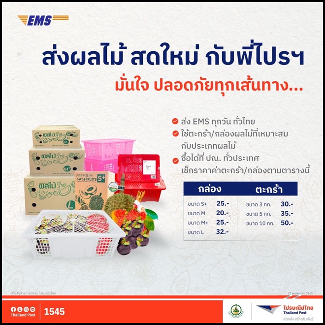 บริษัท ไปรษณีย์ไทย จำกัด ยกระดับการขนส่งผลไม้ให้กับเกษตรกร เปิดตัวกล่องส่งทุเรียนขนาดใหม่ไซส์เอสพลัส : S+ ซึ่งเป็นกล่องขนาดใหม่ที่มีความแข็งแรง ช่วยรักษาความสดใหม่ให้เหมือนซื้อจากสวน และสามารถใส่ทุเรียนขนาด 2-3 กิโลกรัมได้ 1 ลูก ในราคาเพียง 25 บาท โดยยังเดินหน้าบริการ EMS ขนส่งผลไม้ในราคาเหมาจ่ายเริ่มต้น 3 กิโลกรัมแรกเพียง 50 บาท ส่งได้สูงสุดถึง 20 กิโลกรัม และช่วยแบ่งเบาต้นทุนค่าส่งของเกษตรกรชาวสวนได้ถึง 20% จากราคาปกติ นอกจากนี้ยังสมารถเรียกเข้ารับฟรีถึงสถานที่ได้ทุกวันโดยไม่มีค่าบริการ สามารถสอบถามเพิ่มเติมได้ที่ไปรษณีย์ทุกแห่งทั่วประเทศ หรือ THP Contact Center 1545 และ www.thailandpost.co.th