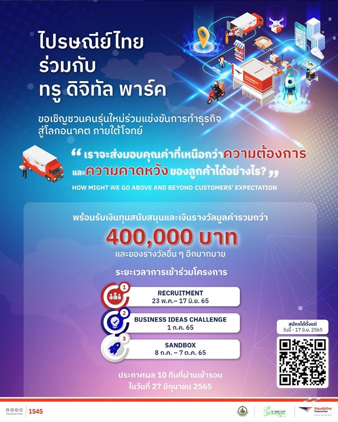 บริษัท ไปรษณีย์ไทย จำกัด ร่วมกับ ทรู ดิจิทัล พาร์ค จำกัด เปิดรับคนรุ่นใหม่ร่วมนำนวัตกรรมยกระดับธุรกิจขนส่ง ผ่านโครงการบ่มเพาะนวัตกรรมสู่ความเป็นเลิศ “Thailand Post: Journey to Startup Sandbox 2022”ภายใต้โจทย์ “เราจะส่งมอบคุณค่าที่เหนือกว่าความต้องการ และความคาดหวังของลูกค้าได้อย่างไร?” โดยความร่วมมือดังกล่าว เป็นการเปิดโอกาส และเปิดรับแนวคิดจากคนรุ่นใหม่เพื่อยกระดับงานบริการของไปรษณีย์ไห้มีประสิทธิภาพที่ดียิ่งขึ้น ผู้ที่ผ่านเข้ารอบ 3 ทีมสุดท้าย จะได้รับสิทธิ์รางวัลเงินทุนสนับสนุนทีมละ 100,000 บาท เพื่อนำไปใช้ในการต่อยอดและพัฒนาธุรกิจ พร้อมทั้งได้รับสิทธิ์ในการใช้พื้นที่ Co-Working Space ณ ทรู ดิจิทัล พาร์ค สถานที่ทำงานที่มีระบบนิเวศที่สมบูรณ์แบบสำหรับสตาร์ทอัพแห่งแรกในไทย และใหญ่ที่สุดในภูมิภาคเอเชียตะวันออกเฉียงใต้ เพื่อสร้างสรรค์นวัตกรรมเป็นระยะเวลา 3 เดือน มูลค่ากว่า 70,000 บาท สมัครเข้าร่วมโครงการได้ตั้งแต่วันนี้เปจนถึงวันที่ 17 มิถุนายน 2565 ผ่าน https://forms.gle/fG4zw7qoYWweSEa7A