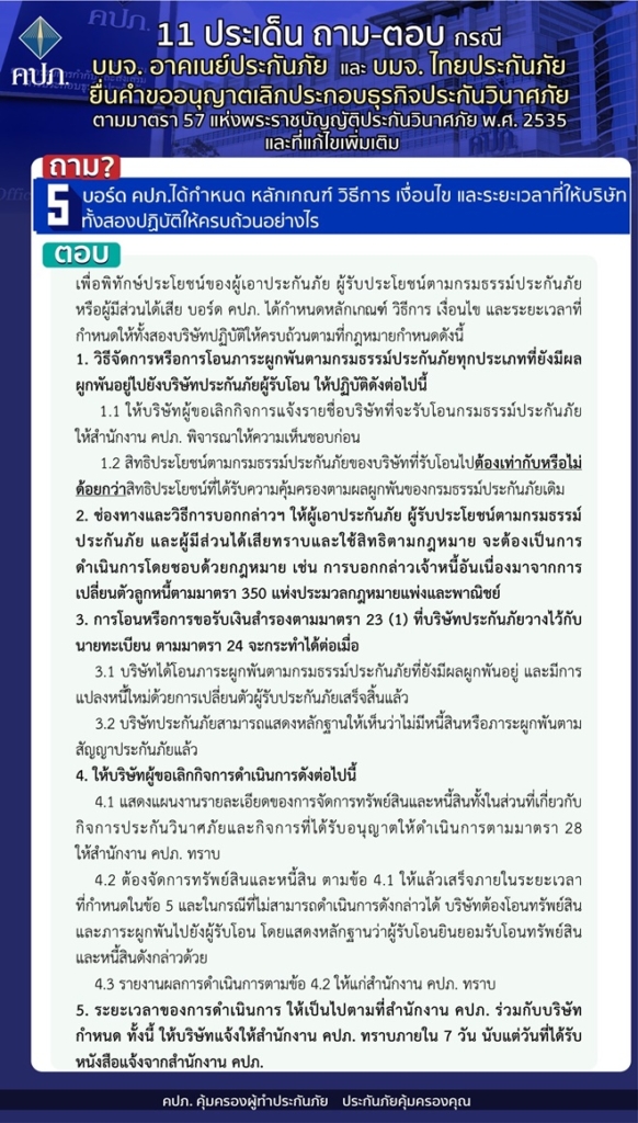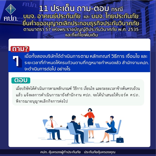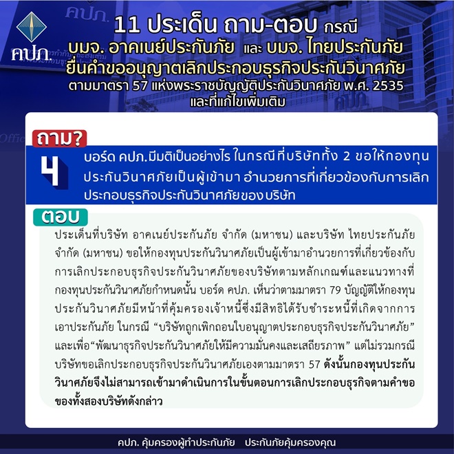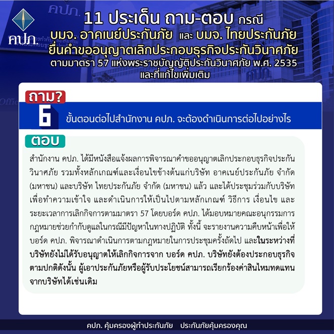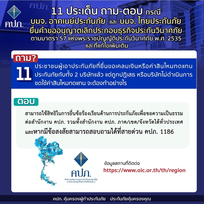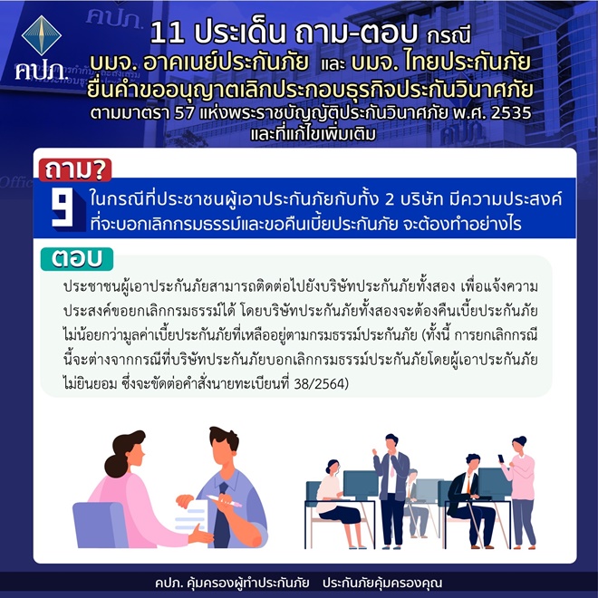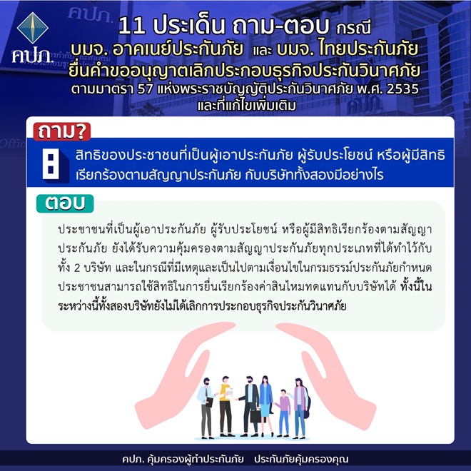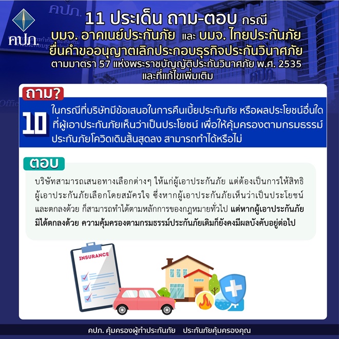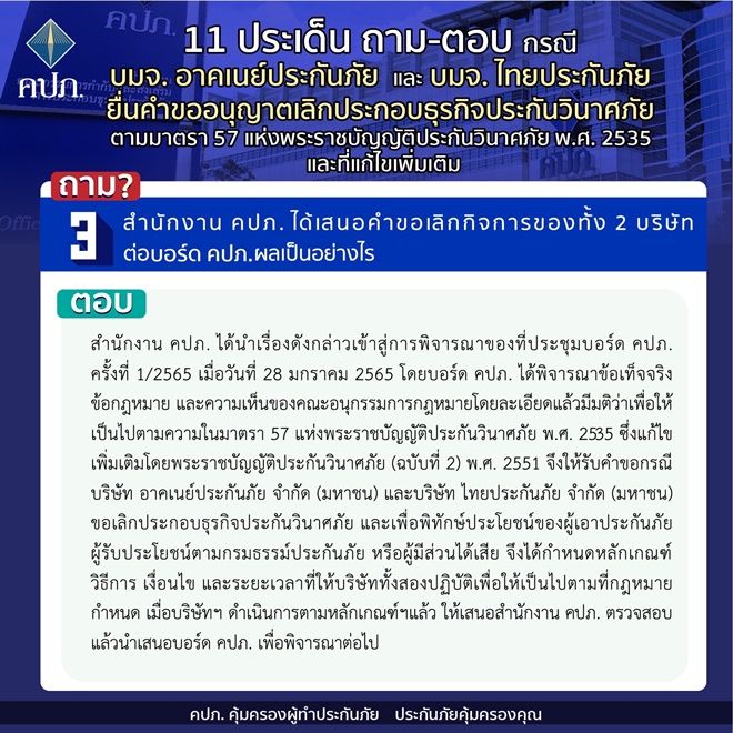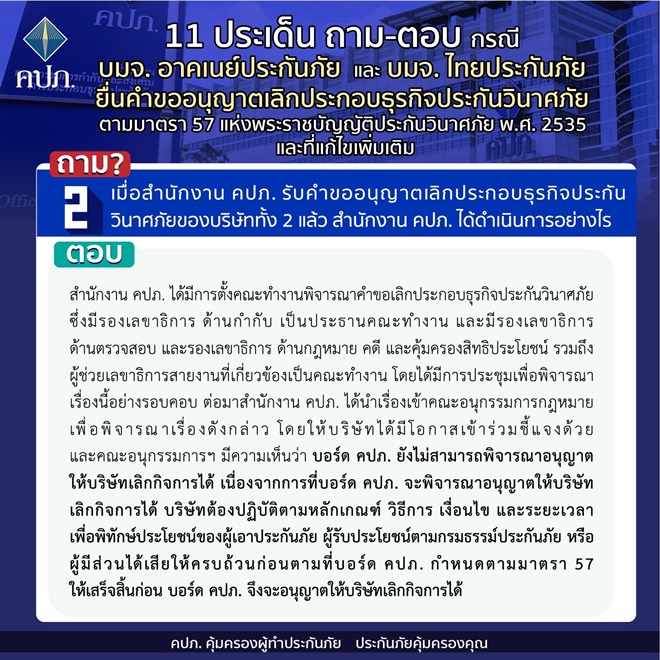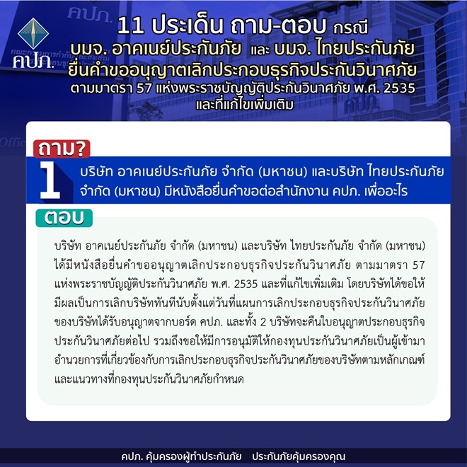 คปภ.แจง 11 ประเด็นถาม-ตอบ กรณี บมจ. อาคเนย์ประกันภัย และ บมจ. ไทยประกันภัย ยื่นคำขออนุญาตเลิกประกอบธุรกิจประกันวินาศภัย ตามมาตรา 57 แห่งพระราชบัญญัติประกันวินาศภัย พ.ศ.2535 และที่แก้ไขเพิ่มเติม