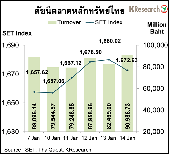 สำหรับสัปดาห์นี้(17-21 ม.ค. 65) บริษัทหลักทรัพย์กสิกรไทย จำกัด มองว่า ดัชนีหุ้นไทยมีแนวรับที่ 1,660 และ 1,650 จุด ขณะที่แนวต้านอยู่ที่ 1,685 และ 1,700 จุด ตามลำดับ โดยศูนย์วิจัยกสิกรไทยประเมินปัจจัยสำคัญที่ต้องติดตาม ได้แก่ สถานการณ์โควิด-19 ทิศทางเงินลงทุนของนักลงทุนต่างชาติ และผลประกอบการไตรมาส 4/64 ของ บจ.ไทย โดยเฉพาะกลุ่มธนาคาร ส่วนข้อมูลเศรษฐกิจสหรัฐฯ ที่สำคัญ ได้แก่ ข้อมูลการเริ่มสร้างบ้านและยอดขายบ้านมือสองเดือนธ.ค. 64 ตลอดจนจำนวนผู้ขอรับสวัสดิการรายสัปดาห์ ขณะที่ปัจจัยต่างประเทศอื่นๆ ได้แก่ การประชุม BOJ ดัชนีราคาผู้บริโภคเดือนธ.ค. 64 ของญี่ปุ่นและยูโรโซน ตลอดจนตัวเลขจีดีพีไตรมาส 4/64 และข้อมูลเศรษฐกิจเดือนธ.ค. 64 ของจีน อาทิ การลงทุนในสินทรัพย์ถาวร