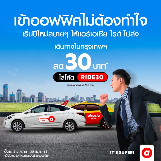 airasia Super App แพลตฟอร์มด้านการท่องเที่ยวและไลฟ์สไตล์ที่มีบริการหลากหลายและเติบโตเร็วที่สุดในอาเซียน มอบส่วนลดต้อนรับการกลับมาทำงานของคน กรุงในศักราชใหม่มกราคม 2566 ด้วยโปรโมชั่น City Ride มอบส่วนลดทันที 30 บาท เพียงใส่โค้ด “RIDE30” เมื่อมียอดใช้งานขั้นต่ำ 150 บาท สำหรับการเดินทางในกรุงเทพฯ โดยเฉพาะในพื้นที่ 10 เขตที่มีความหนาแน่นของการเดินทางในย่านธุรกิจชั้นนำที่มีความต้องการใช้บริการเรียกรถสูง ได้แก่ เขตปทุมวัน เขตดอนเมือง เขตราชเทวี เขตคลองเตย เขตวัฒนา เขตห้วยขวาง เขตจตุจักร เขตสาทร เขตบางรัก เขตคลองสาน ให้ลูกค้าสามารถเดินทางไปทำงานหรือใช้ชีวิตประจำวันได้อย่างประหยัดสะดวกทุกพื้นที่ทั่วกรุงในราคาที่ถูกกว่าใครถึง 15 % ตอกย้ำกลยุทธ์ผู้นำราคาตลาดแอปเรียกรถและต้องการช่วยแบ่งเบาภาระค่าเดินทางคนกรุงฯ