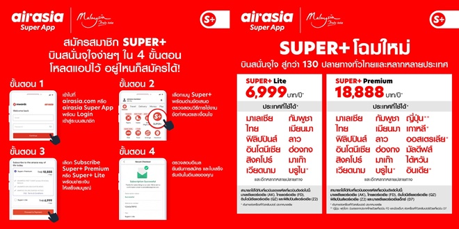ปัจจุบันมีสมาชิกผู้ใช้บริการแพ็กเกจบินสนั่นรายปีจาก SUPER+ ในภูมิภาคมากกว่า 100,000 ราย โดยใช้สิทธิ์แลกเที่ยวบินเดินทางไปแล้วกว่า 500,000 เที่ยวบินทั่วภูมิภาค โดยมีสถิติการแลกสูงสุดถึง 100 เที่ยวบินในเวลา 12 เดือน ทั้งนี้เพื่อตอบโจทย์ความต้องการของนักเดินทางที่มีความชื่นชอบเดินทางไปในจุดหมายปลายทางที่แตกต่างกัน “SUPER+ Subscription” จึงนำเสนอแพ็กเกจสมาชิกรายปี “บินสนั่นจุใจ” 2 รูปแบบ โดยแพ็กเกจเบสิก (SUPER+ Lite) ราคา 6,999 บาท เป็นแพ็กเกจการเดินทางที่ครอบคลุมทั้งเส้นทางภายในประเทศและระหว่างประเทศ อาทิ เส้นทางในอาเซียน ฮ่องกง มาเก๊า และอื่นๆ (รหัสเที่ยวบิน FD,AK,QZ และ Z2) รับ airasia points 800 คะแนน ขณะที่แพ็กเกจพรีเมียม (SUPER+ Premium) ราคา 18,888 บาท ครอบคลุมเส้นทางภายในประเทศและระหว่างประเทศ อาทิ เส้นทางในอาเซียน ฮ่องกง มาเก๊า อินเดีย ไต้หวัน มัลดีฟส์ ฟุกุโอกะ (รหัสเที่ยวบิน FD,AK,QZ และ Z2) รวมถึงเส้นทางญี่ปุ่น เกาหลีใต้ ออสเตรเลีย (รหัสเที่ยวบิน D7 ต่อเครื่องที่สนามบินกัวลาลัมเปอร์) รวมกว่า 130 เส้นทางบิน รับ airasia points 2,000 คะแนน โดยมีสิทธิ์แลกเที่ยวบินรวมตลอดทั้งปีไม่น้อยกว่า 3,000,000 ที่นั่ง (เดินทางด้วยรหัสเที่ยวบิน AK, FD, QZ, Z2 และ D7 สำหรับแพ็กเกจพรีเมียม) นอกจากนี้ผู้สมัครทั้ง 2 ประเภท ยังได้รับส่วนลด 10% ของราคาโดยสารจาก airasia ride และส่วนลด 5% เมื่อจองโรงแรมผ่านแอปพลิเคชัน airasia Super App