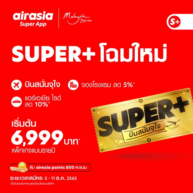 ซึ่ง airasia Super App พร้อมให้คุณบินสนั่นได้มากกว่าเดิมได้แล้ววันนี้ จำกัดการซื้อเพียง 200,000 สิทธิ์ทั่วภูมิภาคเท่านั้น สามารถซื้อได้ตั้งแต่วันนี้จนถึงวันที่ 11 ธันวาคม 2565 เพียงคลิกที่ไอคอน “SUPER+” บนแอป airasia Super App เพื่อซื้อ หรือไปที่ https://app.airasia.com/F4uy/w4vxbhrf