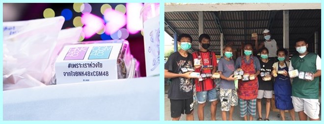 : เฌอปราง – เฌอปราง อารีย์กุล กัปตันวง BNK48 ควงแขนมาพร้อมไข่มุก- วรัทยา ดีสมเลิศ และ ออม- ปุณยวีร์ จึงเจริญ รวมถึงสิตา – สิตา ธีรเดชสกุล เป็นตัวแทนเมมเบอร์ศิลปินไอดอลหญิง BNK48 ทั้งสามรุ่น และศิลปินวงไอดอลหญิงวงCGM48 จากบริษัท อินดิเพนเด้นท์ อาร์ทิสท์ เมเนจเม้นท์ จำกัด ( I AM) ที่รวมความตั้งใจของทุกเมมเบอร์ ทางเมมเบอร์และบริษัทฯ จึงขอเป็นอีกหนึ่งกำลังใจเพื่อบุคลากรทางการแพทย์และบุคลากรจิตอาสา ให้เกิดมีรอยยิ้ม มีกำลังใจในการทำงานต่อไป โดย ไข่มุก BNK48 มีความตั้งใจทำเมนูด้วยตนเอง อาทิ เมนูพุดดิ้งข้าวเหนียวมะม่วง ส่วนนาย BNK48 ได้คว้านผลไม้เงาะบรรจุพร้อมรับประทาน และ มิวสิค BNK48 กับการลงมือทำเมนูคานาเป้ทูน่า เป็นต้น