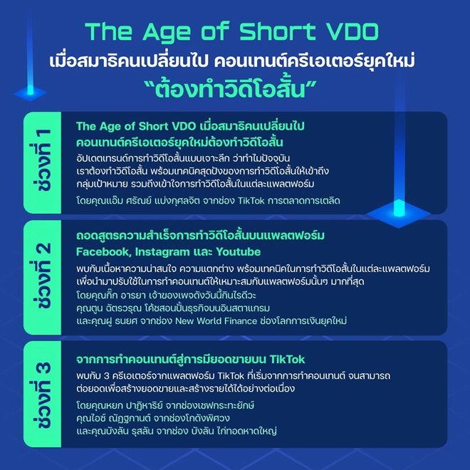 พบกับเนื้อหาความน่าสนใจ ความแตกต่าง พร้อมเทคนิคในการทำวิดีโอสั้นในแต่ละแพลตฟอร์ม เพื่อนำมาปรับใช้ในการทำคอนเทนต์ให้เหมาะสมกับแพลตฟอร์มนั้นๆ มากที่สุด โดย กิ๊ก อารยา เจ้าของเพจดังวันนี้กินไรดีวะ, ตูน ฉัตรวรุณ โค้ชสอนปั้นธุรกิจบนอินสตาแกรม และคุณฝู ธนยศ จากช่อง New World Finance ช่องโลกการเงินยุคใหม่