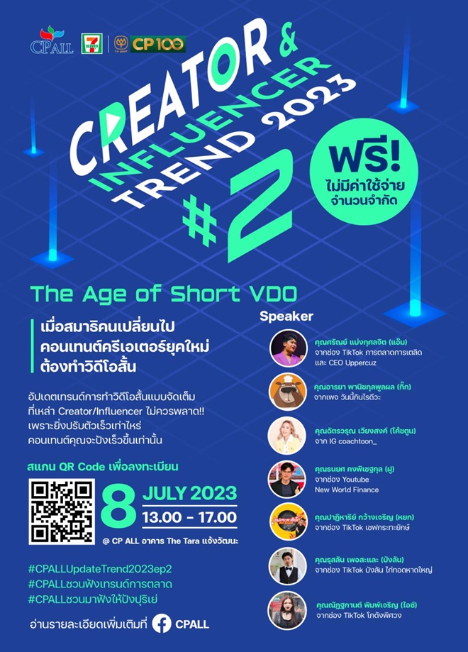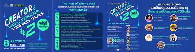 กลับมาอีกครั้ง!! งานดี งานปัง ที่เหล่าครีเอเตอร์และอินฟลูเอนเซอร์ห้ามพลาด กับงาน CP ALL Creator & Influencer Trend 2023 #2 ในธีม The age of short VDO เมื่อสมาธิคนเปลี่ยนไป คอนเทนต์ครีเอเตอร์ยุคใหม่ต้องทำวิดีโอสั้น งานนี้ฟรี!! ไม่มีค่าใช้จ่าย