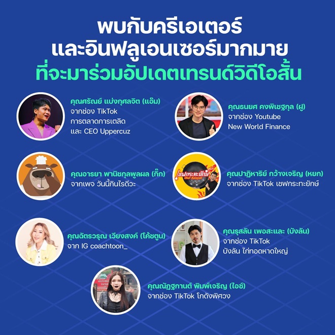 ภายในงานจะได้พบกับการอัปเดตเทรนด์ของการทำคอนเทนต์วิดีโอสั้นโดยเฉพาะ แบบจัดเต็มในทุกแพลตฟอร์ม!! แบ่งเป็น