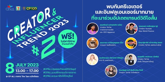 หลังจากประสบความสำเร็จและมีกระแสเรียกร้องหลังจบงาน CP ALL Creator & Influencer Trend 2023 ไปเมื่อต้นปีที่ผ่านมา ซีพี ออลล์ จึงได้เตรียมจัดงาน CP ALL Creator & Influencer Trend 2023 #2 อีกครั้งในธีมสุดล้ำ “The age of short VDO” เมื่อสมาธิคนเปลี่ยนไป คอนเทนต์ครีเอเตอร์ยุคใหม่ต้องทำวิดีโอสั้น พร้อมยกทัพสุดยอด Speaker ที่จะมาอัปเดตเทรนด์การทำวีดีโอสั้นแบบจัดเต็ม ที่เหล่าCreator และ Influencer ไม่ควรพลาด เพราะยิ่งปรับตัวเร็วเท่าไหร่ คอนเทนต์ก็จะปังเร็วขึ้นเท่านั้น ในวันเสาร์ที่ 8 กรกฎาคม 2566 เวลา 13.00-17.00 น. ณ อาคาร เดอะ ธารา ถ.แจ้งวัฒนะ โดยไม่เสียค่าใช้จ่ายใดๆทั้งสิ้น