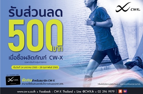 อย่าลืมมาช้อป CW-X ที่จะช่วยให้การวิ่งนี้สนุกขึ้น ได้แล้ววันที่ 14 มกราคม 2565 – 28 กุมภาพันธ์ 2565 ที่ร้านค้า CW-X สาขาสเตเดียมวัน, ศูนย์การค้าซีคอน ศรีนครินทร์, ห้างสรรสินค้าเจพาร์ค ศรีราชา, ศูนย์การค้ายูดีทาวน์ อุดรธานี และศูนย์การค้าซีคอนบางแค สามารถสอบถามรายละเอียดเพิ่มเติมได้ที่ www.cw-x.co.th, Facebook : CW-X Thailand, Line @CWX.th โทร 02 296 9979 เงื่อนไขเป็นไปตามบริษัทฯ กำหนด