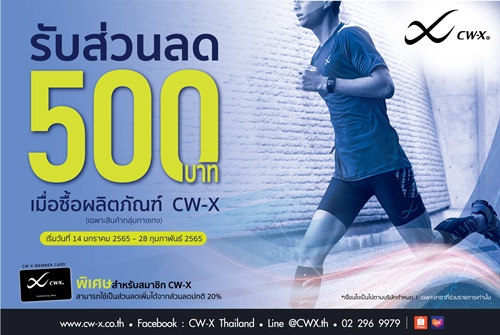 อย่าลืมมาช้อป CW-X ที่จะช่วยให้การวิ่งนี้สนุกขึ้น ได้แล้ววันที่ 14 มกราคม 2565 – 28 กุมภาพันธ์ 2565 ที่ร้านค้า CW-X สาขาสเตเดียมวัน, ศูนย์การค้าซีคอน ศรีนครินทร์, ห้างสรรสินค้าเจพาร์ค ศรีราชา, ศูนย์การค้ายูดีทาวน์ อุดรธานี และศูนย์การค้าซีคอนบางแค สามารถสอบถามรายละเอียดเพิ่มเติมได้ที่ www.cw-x.co.th, Facebook : CW-X Thailand, Line @CWX.th โทร 02 296 9979 เงื่อนไขเป็นไปตามบริษัทฯ กำหนด