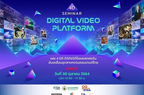 ETDA ผนึกพันธมิตรจัดใหญ่ “Virtual Seminar Digital Video Platform Seminar 4D” เดินหน้าดิจิทัลวิดีโอแพลตฟอร์ม เพื่ออุตฯคอนเทนต์ไทย 30 ต.ค.นี้