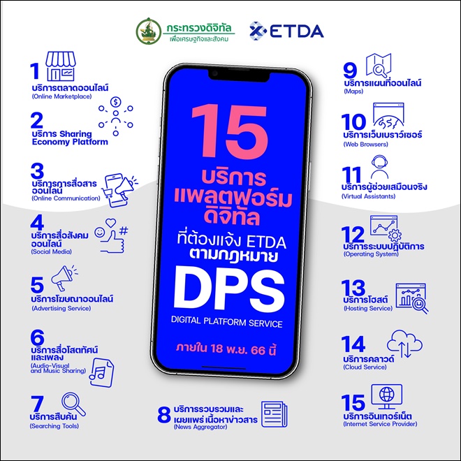 นายชัยชนะ มิตรพันธ์ ผู้อำนวยการ ETDA เปิดเผยว่า ตามที่กฎหมาย DPS หรือ พ.ร.ฎ. การประกอบธุรกิจบริการแพลตฟอร์มดิจิทัลที่ต้องแจ้งให้ทราบ พ.ศ. 2565 ได้กำหนดให้ “ธุรกิจบริการแพลตฟอร์มดิจิทัล ที่เป็นบริการสื่อกลางทางอิเล็กทรอนิกส์ที่ทำให้ผู้ใช้บริการเกิดการเชื่อมต่อเกิดการทำธุรกรรมทางอิเล็กทรอนิกส์ ไม่ว่าจะคิดค่าบริการหรือไม่ก็ตาม ต้องมาแจ้งข้อมูลการประกอบธุรกิจให้ ETDA ทราบ”