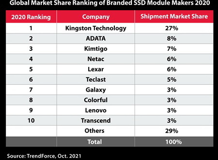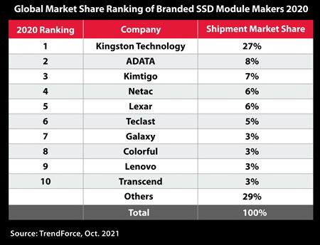 Kingston Technology ผู้นำด้านผลิตภัณฑ์หน่วยความจำและโซลูชันเทคโนโลยีระดับโลก ประกาศว่าได้รับการจัดอันดับจาก TrendForce ให้เป็นซัพพลายเออร์อันดับหนึ่งด้านการจัดส่ง Channel SSD ในปี 2563 โดยจากผลการวิเคราะห์ดังกล่าว Kingston ได้ครองส่วนแบ่งการตลาด 27% ของการจัดส่งผลิตภัณฑ์ 111.5 ล้านชิ้นในปี 2563